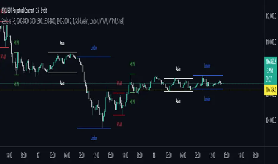 Сесии: включване/изключване на Asian/London/NY AM/NY PM и техните прозорци.