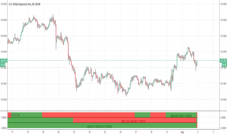 For those who like to trade with the trend instead of against it. This little script shows you what side of the daily/weekly/monthly timeframe open, price is currently trading at so that you dont accidentally trade against the higher timeframe momentum. Timeframes are customizable through the indicator settings panel.