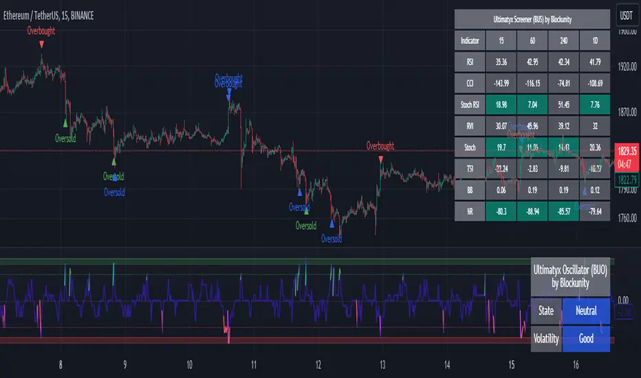 The goal of this indicator is to give you an overview of the status of many indicators on different timeframes. It consists of a Screener and an Oscillator. The oscillator allows you to detect correlations between the indicators included in the Screener in order to give buy and sell points.
