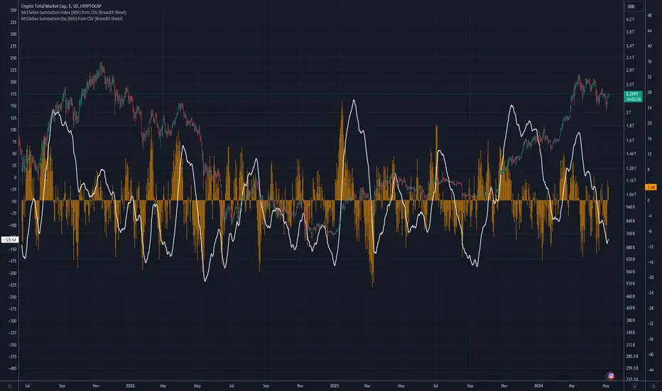 The McClellan Summation Index (MSI) is a cumulative indicator based on the McClellan Oscillator, designed to measure long-term market trends for the top 125 cryptocurrencies by market capitalization.