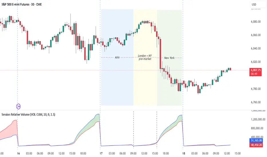 Session Relative Volume is an advanced intraday futures volume indicator that analyzes volume separately for Asia, London, and New York sessions - something standard relative volume tools can’t do.