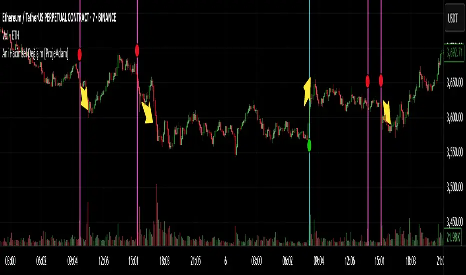 Bu indikatör, bir mumda hacim (volume) normalin belirgin şekilde üzerine çıkarsa bunu fark eder, grafikte vurgular ve isterseniz alarm üretir.