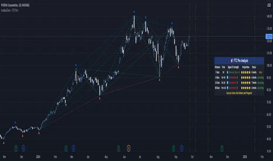 Fibonacci Time Zone Pro is an advanced time analysis tool that helps traders identify potential market turning points through precise time-based projections. By analyzing fractal pivots and swing points, it projects Fibonacci-based time intervals to identify high-probability time windows for market reversals and continuations.