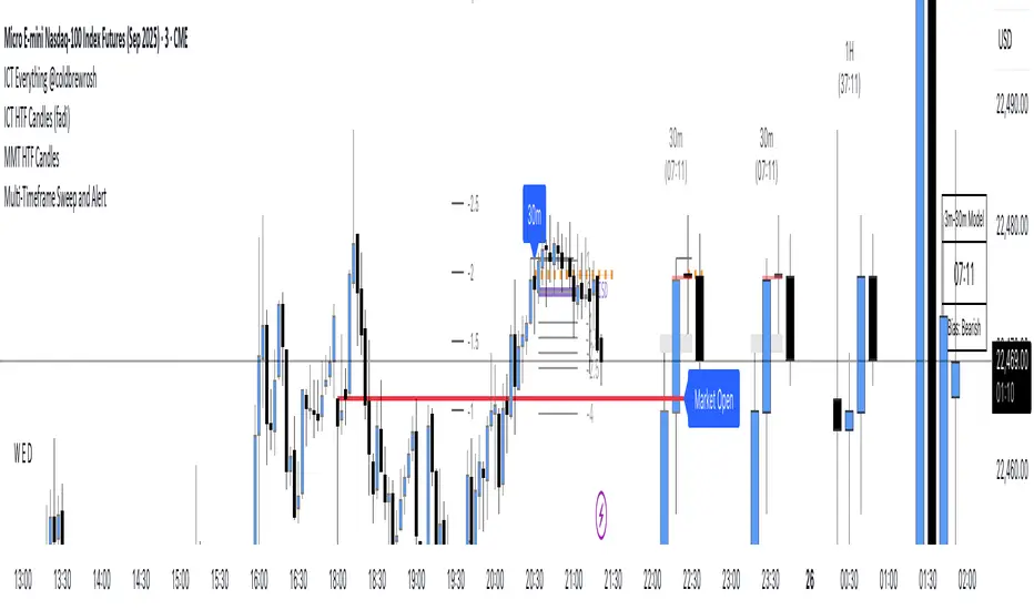 This indicator is designed to be used with trading the Fractal Model, in that it will provide you both a visual alert on the screen as well as the ability to be alerted on your phone / tablet, etc. if a sweep of a higher time frame candle is detected (i.e. 15m, 30m, 1h, 4h, and daily).