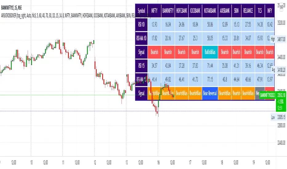 I have created "Artharjan - Index Heavy Weight Components RSI and RSI-Moving Avg Crossover Bullish/Bearish/Neutral Signal" (Short Name - ARSICROSSOVER) indicator for Traders whereby they can see the RSI and RSI Moving Average Values for Indices and Index heavyweight Components at the same time in a Dashboard.