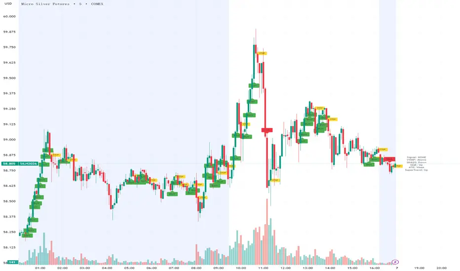 Panel: Displays live readings for VWAP, SMA, QQE, ATR regime, and SuperTrend direction.