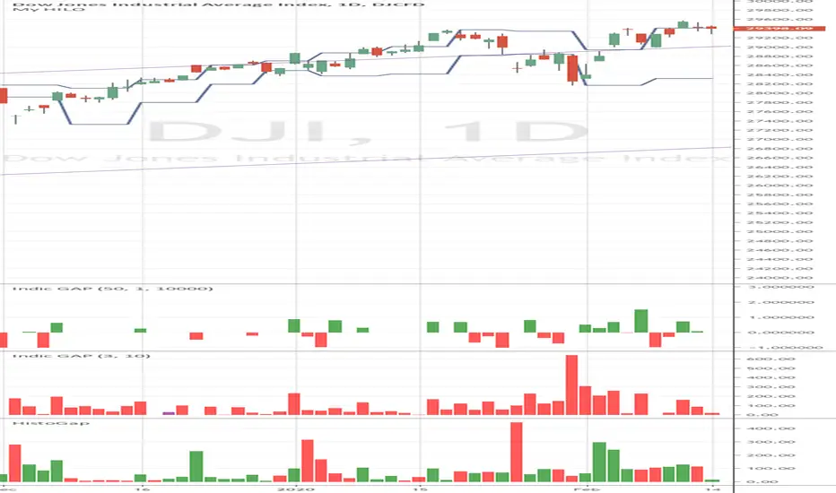 Script calculates gaps from the previous candle close to the current candle open. The computation is displayed into an histogram.