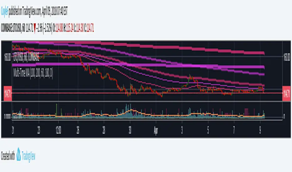 This indicator plots the chosen EMA length (def 100) and the SMA length (def 200) on each of the chosen time frames (def 1hr, 3hr, and Daily)