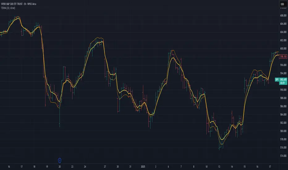 TEMA calculates three levels of EMAs, then combines them using a special formula that amplifies recent price action while reducing lag. This triple-processing approach effectively eliminates much of the delay found in traditional moving averages.