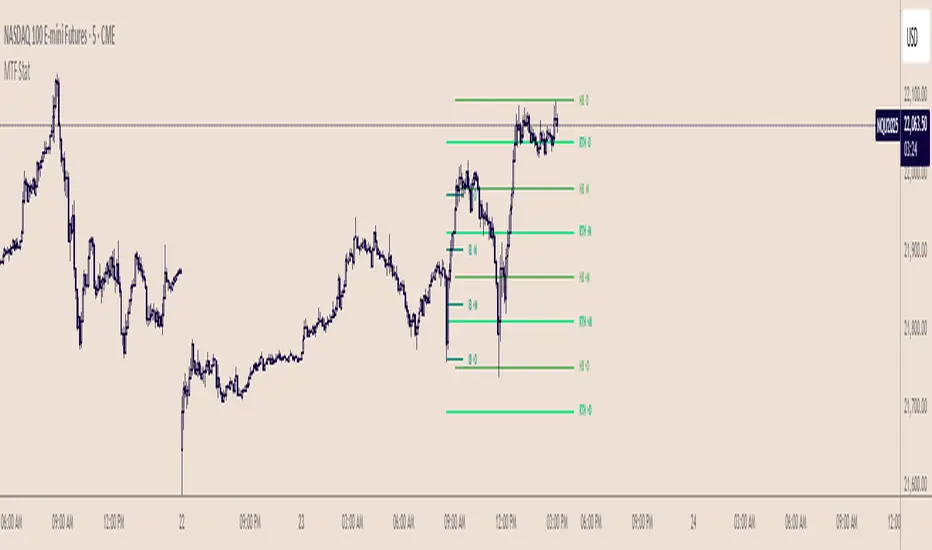MTF Stat is a powerful multi-timeframe analysis tool that automatically calculates and displays statistical price levels based on historical session ranges (HSR). This indicator helps traders identify key manipulation, distribution, and expansion levels across multiple timeframes simultaneously.