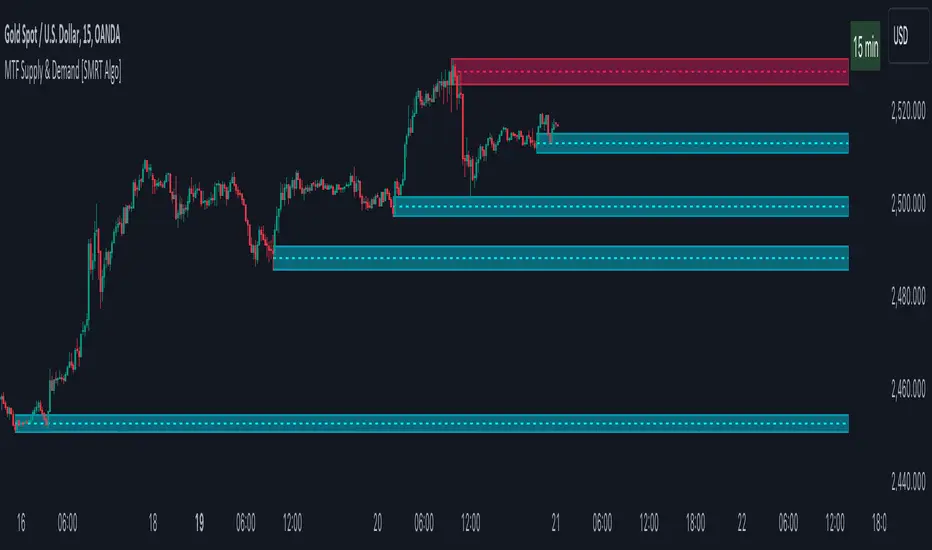 The indicator automatically identifies and highlights supply and demand zones on the chart, which are critical areas where the market is likely to reverse or experience significant price movement. These zones represent areas of strong buying (demand) or selling (supply) pressure, making them key levels for potential trade setups. The clear visualization of these zones on the chart helps traders quickly identify important price levels without manual analysis. - Multi-Timeframe Functionality: