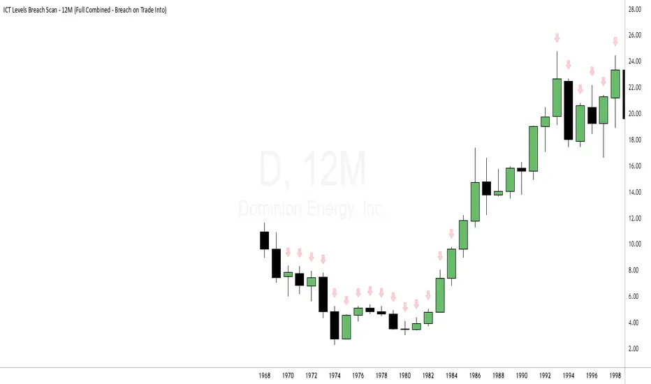 Detects and scans for breaches of key Inner Circle Trader (ICT) concepts on the yearly (12M) chart: Swing Lows (3-bar wick pivots), Rejection Blocks (3-bar body pivots), Fair Value Gaps (3-bar inefficiencies), and Volume Imbalances (bullish body gaps ≥0.15%, unmitigated).