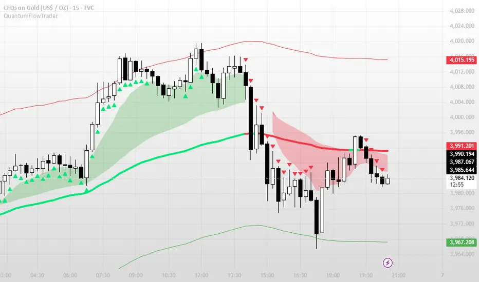 QuantumFlowTrader enhances it with tested adaptive deviation envelopes, which highlight zones where price frequently reacts or pauses.