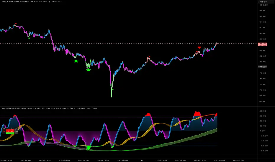 Standard WT1/WT2 crossover signals are available on each timeframe. Bullish crossovers (WT1 crossing above WT2) and bearish crossovers (WT1 crossing below WT2) are marked with triangle shapes. When these crossovers occur in overbought or oversold territory, they carry more significance.