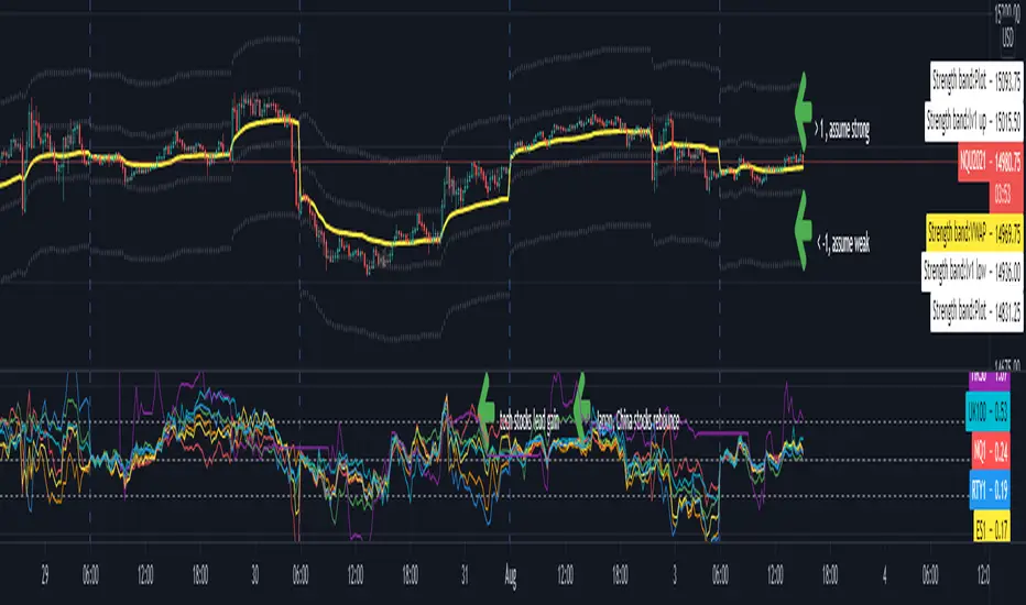 For each ticker, we obtain an indexed value (base on the band) which gauge the relative strength of each global index.