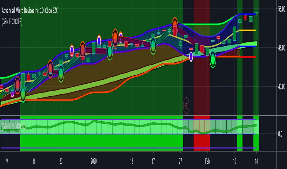 The primary principals of Hurst cycles are price moves in waves that exhibit cyclic attributes based on their time scales. Genie Cycles incorporates Hurst cycles theories, but utilizes only two nested Laguerre moving filters. Laguerre moving filters have significantly less lag than traditional moving averages. These moving filters take as there inputs the highest high and the lowest lows for the two adjustable periods. The point of the indicator is to determine when a short-term swing cycle harmonizes or aligns with a long-term cycle, i.e., determining when the tops and bottoms of these cycles align.