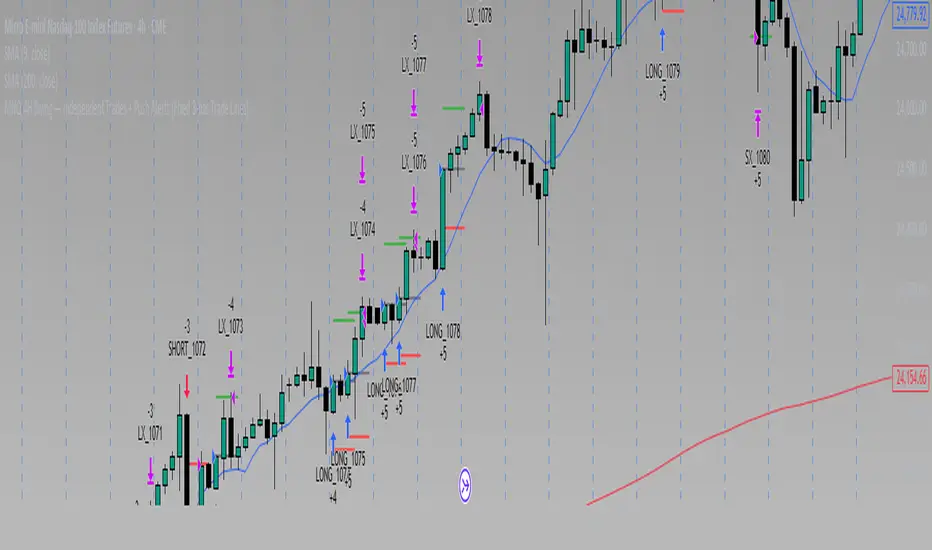 // Strategy: MNQ 4H Swing — Independent Trades + Alerts + Trade Lines