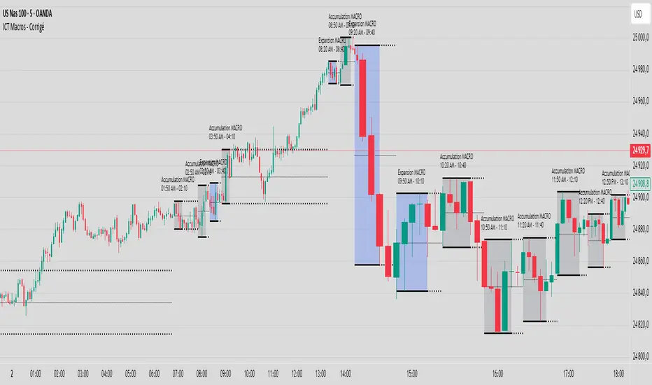This indicator is designed to help traders apply the concepts of ICT (Inner Circle Trader) by providing a clear and accurate visualization of market macros directly on the chart. Instead of manually drawing levels or constantly switching between timeframes, the indicator automatically highlights the key reference points that form the backbone of ICT analysis.
