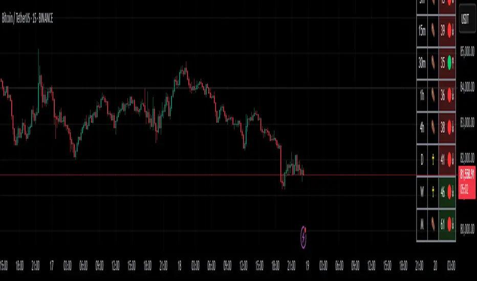 This Multi-Timeframe (MTF) Screener is designed to monitor key technical signals across multiple timeframes (1m, 3m, 5m, 15m, 30m, 1h, 4h, D, W, M) on a live chart, with a toggle switch for user control. The screener displays two essential indicators:
