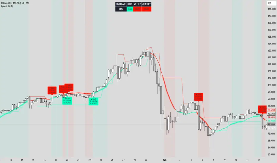 Zero-Lag Liquidity Confluence System is a multi-timeframe trend alignment and execution planning indicator designed to highlight high-probability trade opportunities when higher timeframe structure agrees. The script evaluates Daily, Weekly, and Monthly candle bias to determine full directional confluence, only allowing signals when all three timeframes are aligned. A zero-lag EMA model provides responsive trend detection while minimizing delay, acting as the primary trigger mechanism. In addition, the system dynamically identifies volume-backed liquidity breakouts to establish adaptive supply and demand levels, which are then used for intelligent stop placement. When confluence and trigger conditions align, the indicator automatically generates a structured trade plan, including entry, stop loss, and take profit levels based on a configurable risk-to-reward ratio. A real-time dashboard displays higher timeframe bias, while visual glow and background cues emphasize alignment states. This tool is built for traders who prioritize structure, confirmation, and disciplined risk management over reactive signal chasing.