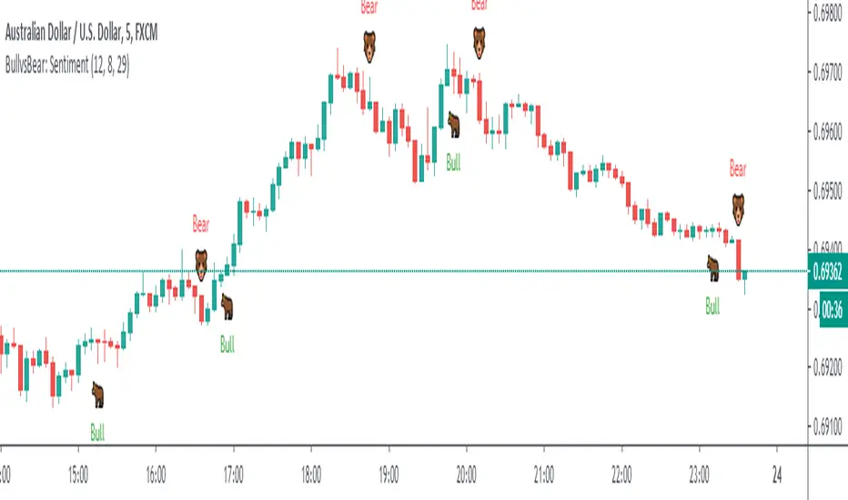 A useful indicator for scalpers who try to make profits out of small price movements intraday basis. I reckon with the combination of this indicator with other trading tools short term traders might gain some further trading edge in the market. The beauty of this indicator is that it tells any traders in a glance that what current market sentiment outlook is with those beautiful tiny bears and bulls character. The indicator has been created by the fusion of Exponential Moving Average (EMA) and Moving Average Convergence Divergence (MACD) with conjunction to normal arithmetic conditional calculations. It is especially for the short term traders (scalper/scalping) who rely on the short price changes throughout the day on any financial market assets class. The purpose of this indicator is to serve a short term trader buy or sell signals which we can clearly see through the sweet character "Bull" which indicates the "Long/Buy" signal where character "Bear" indicates "Short/Sell" signal. One can immediately trade when the signal is generated and must switch the direction without any delay if the opposite direction signal has emerged so as not to get caught in potential risk or even loses. This indicator can also be used for midterm trade so there are no limits in the scope for use of this indicator and it all depends on users who need to test and feel on multiple timeframes and different financial assets class. It supports the alert feature too so a user can activate it to stay aware of new signals by receiving notification on every new signal generation. In the end, nothing is guaranteed in the financial market, and profits and losses are part of games so to avoid any losses or trade wisely this indicator should be used in conjunction with other useful trading tools in this way the odds should increase with a good trading edge in the market.