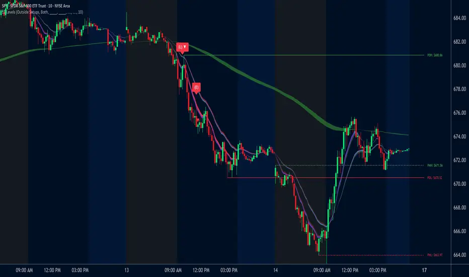 The wave is made from the 8, 9, and 10 EMAs and fills the space between them to create a “wave” look. The 8 EMA Wave continuously updates its color based on where price trades relative to the key levels (PDH, PDL, PMH, PML). The color changes are conditional and based solely on price position relative to key levels.