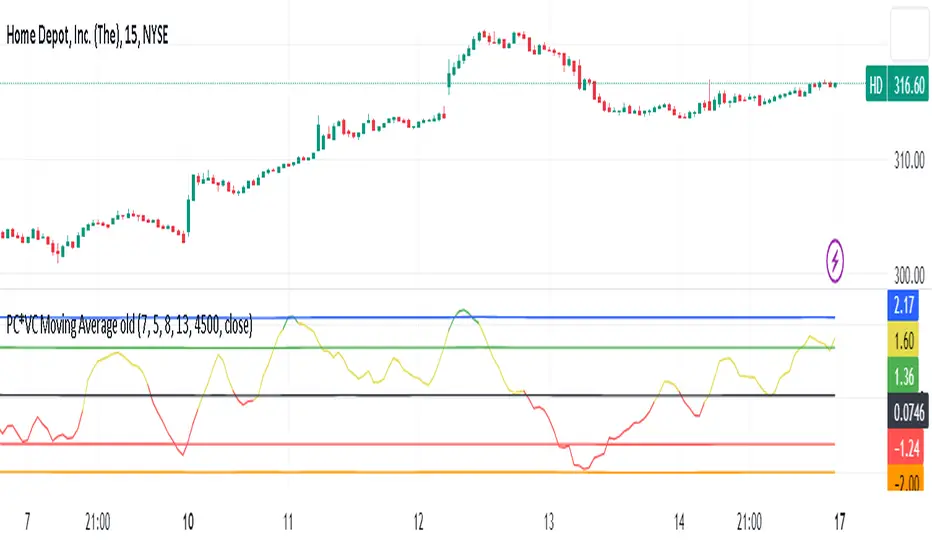 Overall, this code calculates the PC*VC/IDV Ratio indicator, which combines price, volume, and intraday volatility information. The indicator's values are plotted on the chart, along with reference lines indicating potential overbought or oversold conditions.