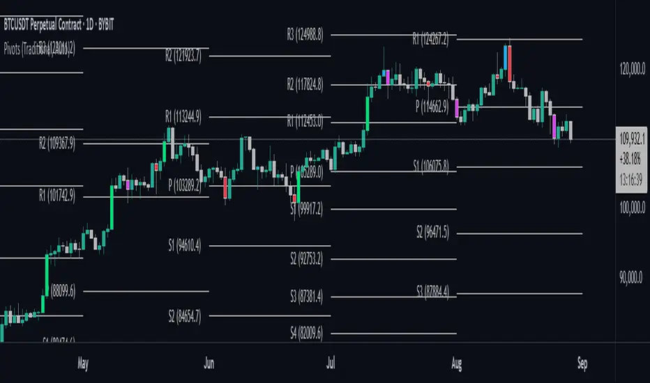 Този индикатор комбинира **динамични пивот точки** с **обемно-базирани свещи**, за да предостави мощен инструмент за технически анализ. Поддържа няколко метода за изчисление на пивотите, включително *Traditional*, *Camarilla*, *Fibonacci*, *Woodie* и *DM*, като визуализира до 11 ключови нива (P, S1–S5, R1–R5).