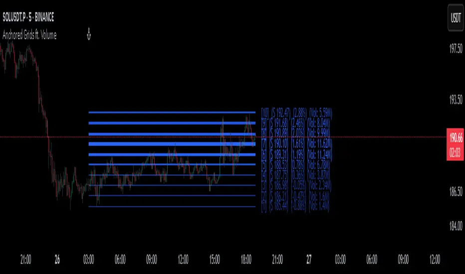 'Anchored Grids ft. Volume' is a sophisticated technical analysis tool that combines price grid analysis with volume accumulation metrics. This indicator dynamically calculates and displays custom support and resistance levels based on a user-defined timeframe, while simultaneously tracking and visualizing volume accumulation at each specific price level. Unlike traditional volume profile indicators that use complex statistical clustering, this tool provides straightforward volume measurement at predetermined technical levels. It answers a critical question: "How much trading activity occurred near the key price levels I care about?".