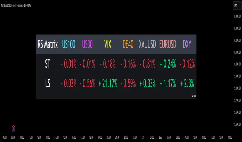 The Relative Strength Matrix provides a comprehensive view of how the current asset performs against a basket of other financial instruments (such as Indices, Commodities, or Currencies). By comparing price changes over two distinct timeframes (Short-Term and Long-Term), traders can quickly identify whether the asset is showing relative strength or weakness compared to the broader market or specific sectors.