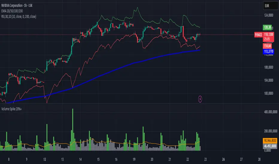This indicator highlights volume spikes that exceed the 20% threshold above the 20-period simple moving average of volume.