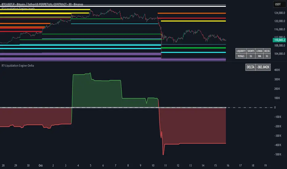The RT-Liquidation Engine-Levels and RT-Liquidation Engine-Delta tools provide an approximation of where leveraged positions might be vulnerable based solely on chart data. They do not access actual exchange liquidation feeds, does not reveal real trader positions, and cannot guarantee that a projected level will cause price to react.