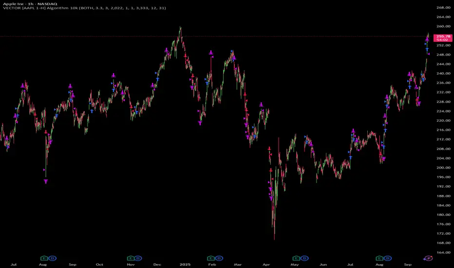 Vector Algos combines trend-following and mean-reversion logic - tuned for AAPL on the 1 H timeframe - to cut through market noise and distortion. By default our system: