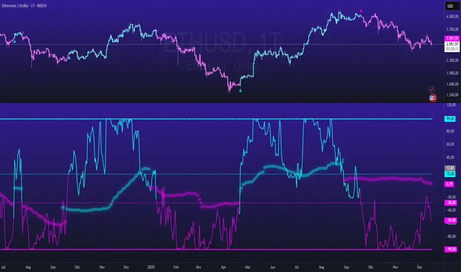 - Asymmetric trend thresholds (default Long +15 / Short –28) reflect the empirical observation that downside momentum is usually sharper and faster