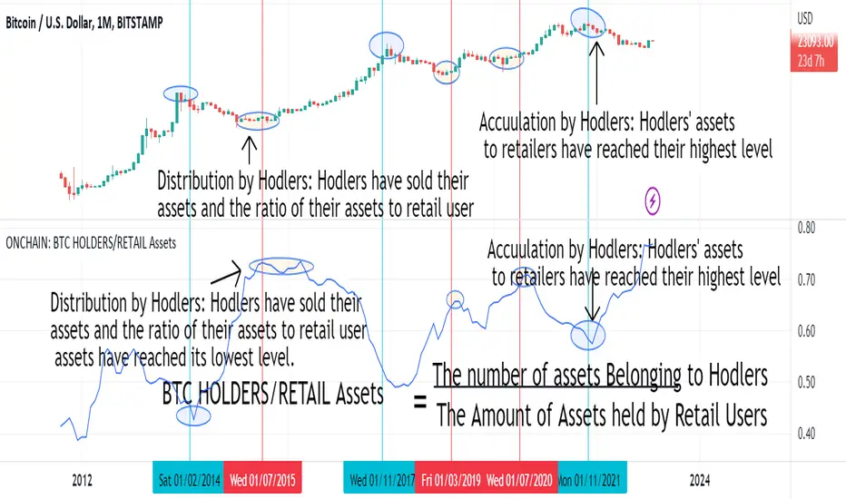 This indicator measures the ratio of Hodlers' assets to Retails' assets based on the On-chain data of Intotheblock platform (you can find it on Sources). This is consistent with Wyckoff's theory of accumulation and distribution. At the top of the market, Hodlers have sold most of their assets to retailers, so this ratio is at its lowest. At market bottoms, Hodlers accumulates the asset at low prices. The uptrend and downtrend of this indicator can also be used to confirm the uptrend or downtrend of the Bitcoin market.