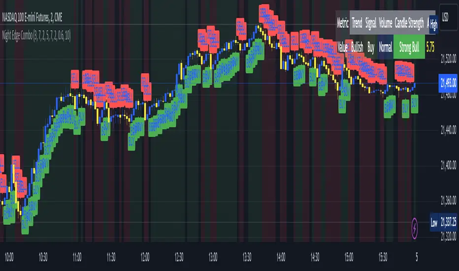 The **Night Edge Combo** is a versatile TradingView indicator designed for new traders to make informed trading decisions during night trading. It combines multiple technical analysis tools into a simple and visually appealing format. Key metrics like trend direction, buy/sell signals, volume conditions, and candle strength are displayed in a table for clarity and ease of use.