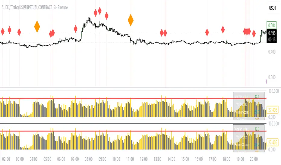 appears when tension index exceeds threshold with normal candle size. this is a predictive signal—market is compressed but explosion hasn't occurred yet. optimal for entry before movement with tight stop.​