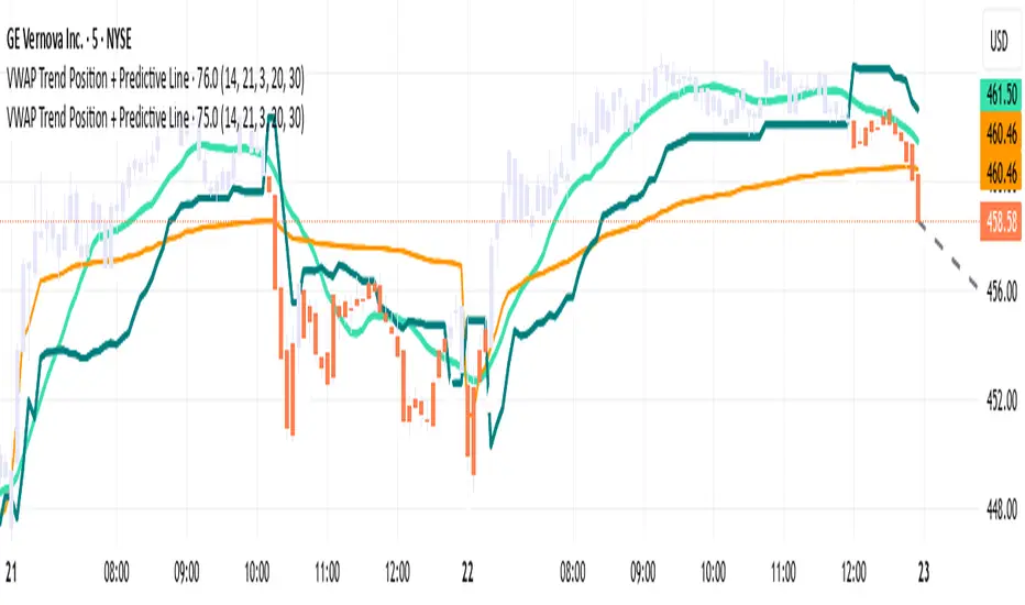 This script (VWAP Trend Position + Predictive Line) plots the VWAP (Volume-Weighted Average Price) and uses recent highs/lows adjusted by ATR (volatility) to figure out the current market trend. If the price breaks above the high threshold, it considers the trend bullish; if it drops below the low threshold, it considers the trend bearish. Candles are colored to reflect this: lavender for uptrends, coral for downtrends, and yellow when there's no clear direction. It also draws a teal line to visualize the active trend level and marks trend reversals with a small triangle below the candle.