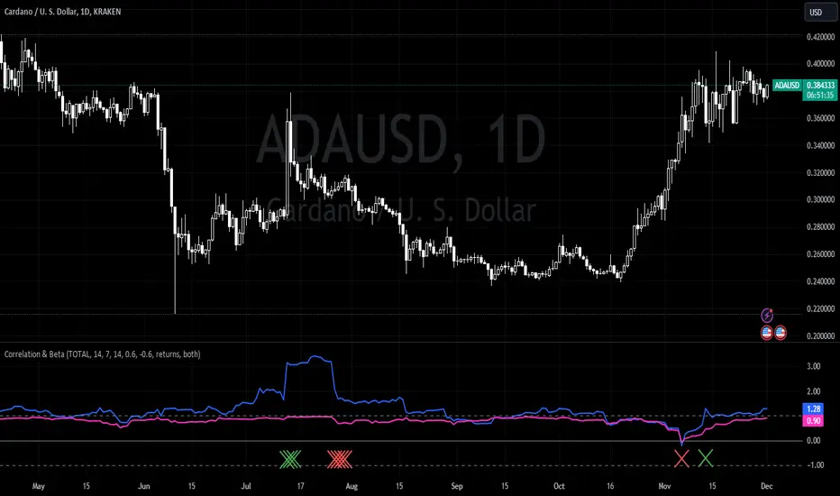 Correlation and Beta weighted against the TOTAL Crypto Market Cap over a 14 day lookback period. User settings are customizable.