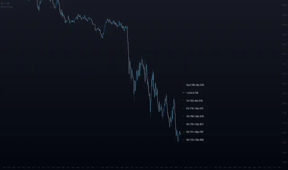 The BB Sidecar Calculator is a precision planning tool designed to help traders visualize risk, reward, and position sizing directly on their charts. By inputting basic trade parameters, the indicator calculates stop-loss distance, potential profit targets in R multiples, and total dollar risk or gain based on the instrument type and lot size. It supports a wide range of assets including futures, forex, and equities.
