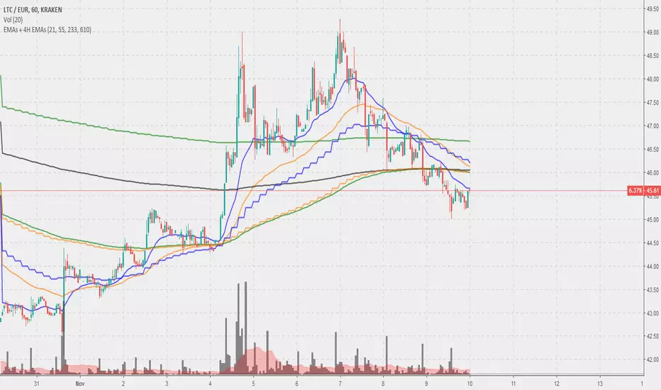 This indicator plots 4 EMAs of a current time frame and 4 EMAs of 4h of the same length on the same price chart. It works on any time frame below 4h. I personally prefer using it on any time frame bellow 2h. It provides some better perception of a potential support and resistance areas.