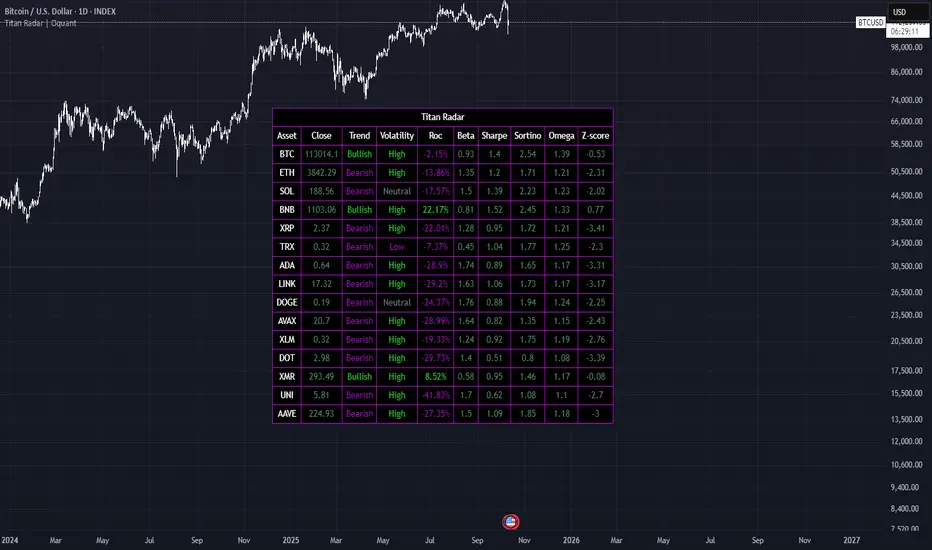Titan Radar is a comprehensive multi-asset screener designed to provide traders with a view of key market dynamics across up to 15 user-selected assets. It aggregates essential metrics such as trend states, volatility levels, rate of change (ROC), beta, risk-adjusted performance ratios (Sharpe, Sortino, and Omega), and Z-scores into an table format(Remember past performance doesn’t guarantee future results). This tool helps identify potential opportunities by highlighting assets with bullish or bearish trends, high, low or neutral volatility, momentum shifts, and relative performance characteristics, all while emphasizing risk management through established financial metrics(Remember past performance doesn’t guarantee future results).