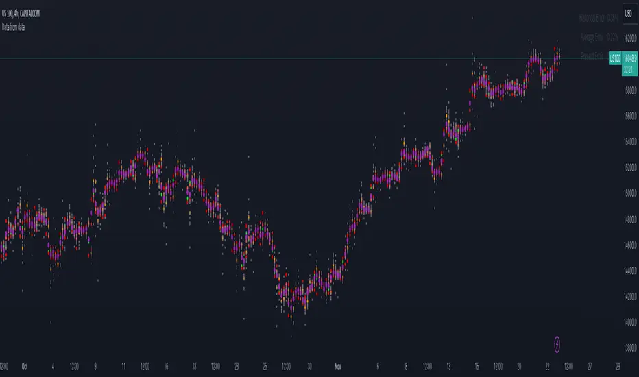 The indicator provides a detailed error analysis, including historical error, average error, and present error. This information is presented in a user-friendly table for quick reference. This table can be used to analyze the margin of error of the expected future price.