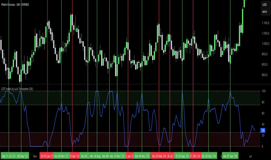 Since COT data is published only once per week and the COT Index is built on cyclical multi-week analysis, the indicator is intended to be used exclusively on the weekly timeframe.