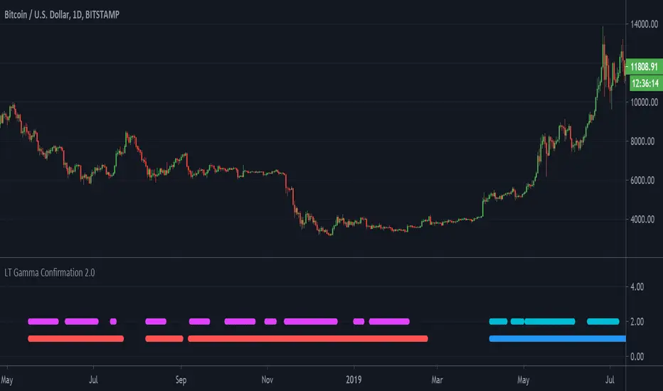 This is a momentum and trend based indicator which can show the likely “path of least resistance”. With this indicator we can visually see both the probable short term and long term force of the trend. We can also use this as a “filter” in combination with the LT Pulse. When the gamma confirmation dots are dark blue, this can indicate that the likely path of least resistance - or the stronger trend – is more likely to be to the upside. Cyan coloured dots indicate when the pressure or momentum may increase to the upside (i.e. increasing positive momentum). The red colour gamma confirmation dots indicate when the likely path of least resistance - or the stronger trend - is likely to be to the downside. Magenta dots indicate when the pressure or momentum could increase to the downside (i.e. increasing negative momentum).