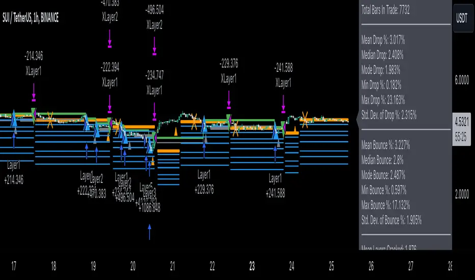 The strategy script monitors a chart price action and identifies bases as they form. When bases are reached the script provides entry actions. During price action development an asset value can go lower and in this way the script will perform safety entries at each subsequent accumulation levels. When weighted average entry price reaches target profit the script will perform a take profit action.