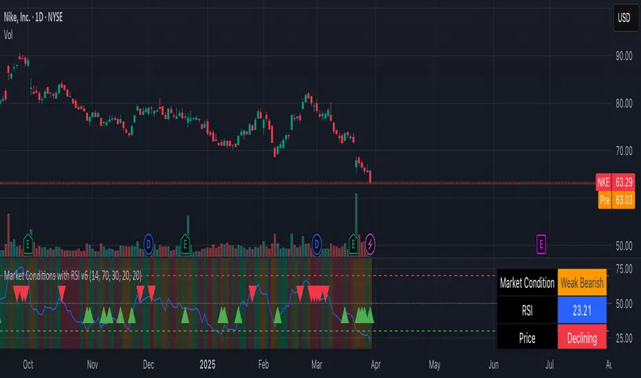 This indicator combines price action, volume, and RSI (Relative Strength Index) to identify market conditions and generate trading signals.