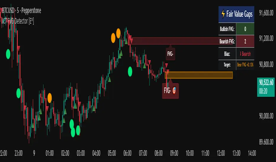 ⚡ Fair Value Gap Detector Overview The Fair Value Gap Detector automatically identifies price imbalances on your charts - the inefficiencies left behind when price moves too quickly. This indicator reveals where price is likely to return for "rebalancing", based on ICT (Inner Circle Trader) concepts of market efficiency. ━━━━━━━━━━━━━━━━━━━━━━━━━━━━ 🎯 What This Indicator Does Detects Fair Value Gaps: • 🟢 Bullish FVG - Gap left below during aggressive upward move • 🔴 Bearish FVG - Gap left above during aggressive downward move • Automatically identifies 3-candle price inefficiencies • Works on all timeframes and instruments Smart Fill Tracking: • Full Fill - Price completely fills the gap • 50% Fill - Price fills half the gap (critical level) • Partial Fill - Price touches gap edge • Real-time fill percentage tracking • Auto-removes filled gaps (optional) Professional Features: • Active Gap Highlighting - Shows nearest unfilled gap • Distance Calculator - Displays how far price is from gaps • Market Bias - Analysis based on gap balance • Size Filtering - Minimum gap size to avoid noise • Visual Clarity - Clean boxes with color-coding ━━━━━━━━━━━━━━━━━━━━━━━━━━━━ 📚 Understanding Fair Value Gaps What Are Fair Value Gaps? Fair Value Gaps (FVGs), also known as imbalances or inefficiencies, are zones where price moved so quickly that normal trading didn't occur. They represent: • Price Imbalance - One-sided aggressive buying or selling • Unfair Pricing - Some participants didn't get to trade at these levels • Market Inefficiency - Supply/demand equilibrium was disrupted • Rebalancing Zones - Price often returns to "fill" these gaps The ICT Concept: Markets constantly seek equilibrium (fair value). When price moves too fast: 1. It leaves gaps where normal trading didn't happen 2. These gaps represent unfair/inefficient pricing 3. Market has a tendency to return and "rebalance" 4. Smart money knows this and trades the fills Why FVGs Work: • Unfilled Orders - Traders who missed the move have pending orders in the gap • Algorithmic Trading - Algos programmed to exploit inefficiencies • Market Psychology - Traders notice gaps and place orders there • Institutional Behavior - Smart money uses gaps for entries/exits FVG vs Regular Gaps: • Regular Gaps - Occur at market open, between daily closes • Fair Value Gaps - Occur intraday, between 3 consecutive candles • FVGs happen more frequently and on all timeframes • FVGs are more tradeable for intraday/swing traders ━━━━━━━━━━━━━━━━━━━━━━━━━━━━ 🟢 Bullish Fair Value Gaps Explained How They Form: Bullish FVG requires 3 candles: 1. Candle 1 - Any candle (sets the high reference) 2. Candle 2 - Strong bullish candle (aggressive buying) 3. Candle 3 - Continuation candle The Gap: Candle 3's LOW is above Candle 1's HIGH = Gap left unfilled Visual Example: ``` Candle 3: Low at $105 ──────────┐ │ ← GAP (Bullish FVG) Candle 2: Strong bullish │ │ Candle 1: High at $100 ──────────┘ ``` What It Means: • Price jumped from $100 to $105+ so fast, no trading occurred in between • This $100-$105 zone is "unfair" - buyers/sellers didn't get to trade there • Market may return to this zone to "rebalance" • When price returns, it often acts as support Trading Bullish FVGs: Strategy: • Wait for price to retrace down into the bullish FVG (green box) • Look for rejection/bounce from the gap zone • Enter long when price respects the FVG as support • Stop loss: Below the FVG • Target: Previous high or opposite FVG Best Entry Points: • 50% Fill: Price enters middle of gap (highest probability) • Full Fill: Price touches bottom of gap (aggressive entry) • Tap & Reject: Price quickly enters and exits gap (strong signal) Example Trade: • Bullish FVG forms: $50,000 - $50,500 (500 point gap) • Price rallies to $52,000 then retraces • Price drops to $50,250 (50% of gap filled) • Bullish reversal candle appears • Enter long at $50,500, stop at $49,800 • Target: $52,000+ ━━━━━━━━━━━━━━━━━━━━━━━━━━━━ 🔴 Bearish Fair Value Gaps Explained How They Form: Bearish FVG requires 3 candles: 1. Candle 1 - Any candle (sets the low reference) 2. Candle 2 - Strong bearish candle (aggressive selling) 3. Candle 3 - Continuation candle The Gap: Candle 3's HIGH is below Candle 1's LOW = Gap left unfilled Visual Example: ``` Candle 1: Low at $100 ───────────┐ │ ← GAP (Bearish FVG) Candle 2: Strong bearish │ │ Candle 3: High at $95 ───────────┘ ``` What It Means: • Price dropped from $100 to $95 so fast, no trading occurred in between • This $95-$100 zone is "unfair" - buyers/sellers didn't get to trade there • Market may return to this zone to "rebalance" • When price returns, it often acts as resistance Trading Bearish FVGs: Strategy: • Wait for price to retrace up into the bearish FVG (red box) • Look for rejection/reversal from the gap zone • Enter short when price respects the FVG as resistance • Stop loss: Above the FVG • Target: Previous low or opposite FVG Best Entry Points: • 50% Fill: Price enters middle of gap (highest probability) • Full Fill: Price touches top of gap (aggressive entry) • Tap & Reject: Price quickly enters and exits gap (strong signal) Example Trade: • Bearish FVG forms: $48,000 - $48,500 (500 point gap) • Price drops to $46,000 then retraces • Price rallies to $48,250 (50% of gap filled) • Bearish reversal candle appears • Enter short at $48,000, stop at $48,700 • Target: $46,000- ━━━━━━━━━━━━━━━━━━━━━━━━━━━━ 📊 How To Use This Indicator Strategy 1: FVG Re