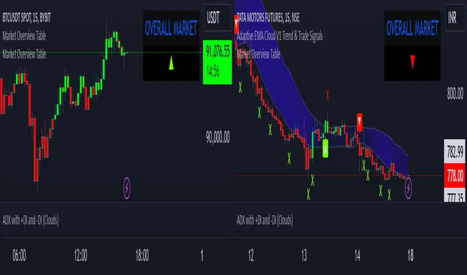 This script creates a market overview table that aggregates the signals from seven technical indicators into a single overall market trend. The goal of the table is to provide a quick summary of the market condition based on the combined behavior of multiple popular indicators. Instead of displaying each individual indicator's trend separately, it summarizes them into one overall market signal, displayed as a triangle (either up or down). This simplifies the decision-making process by focusing on an easy-to-read visual cue.