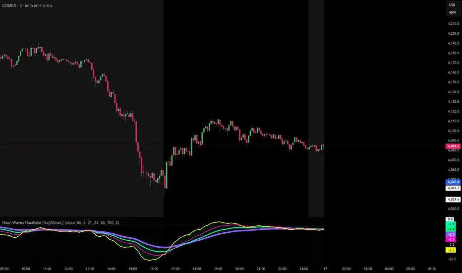 The Neon Waves Oscillator is inspired by modern neon-style visual design and displays four smooth waves representing normalized price movement using ATR. The waves highlight changes in momentum, volatility, and market rhythm in a clean, sharp, and visually appealing way, enhanced by a soft glow effect that adds depth and clarity.